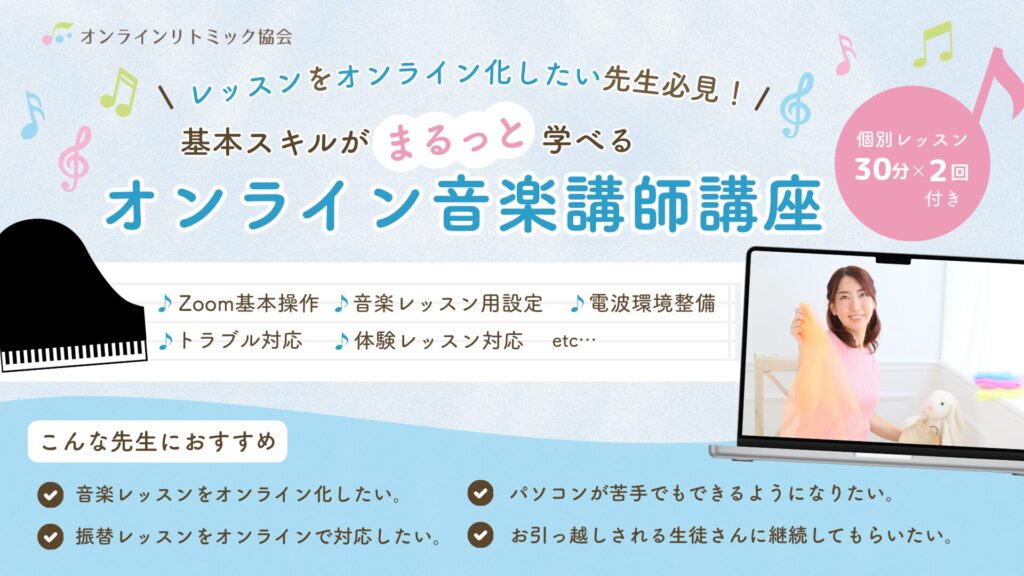 オンラインでリトミック指導をするために必要な、スキルと知識を学べる講座です。Zoomを使ったリアルタイムの講義と、動画で学んでいただけます。